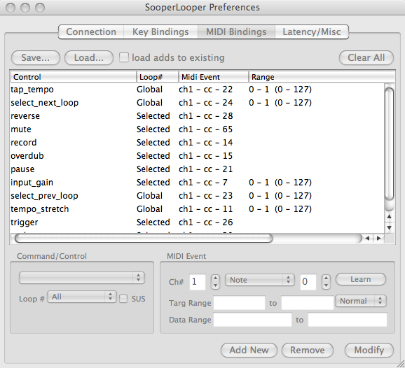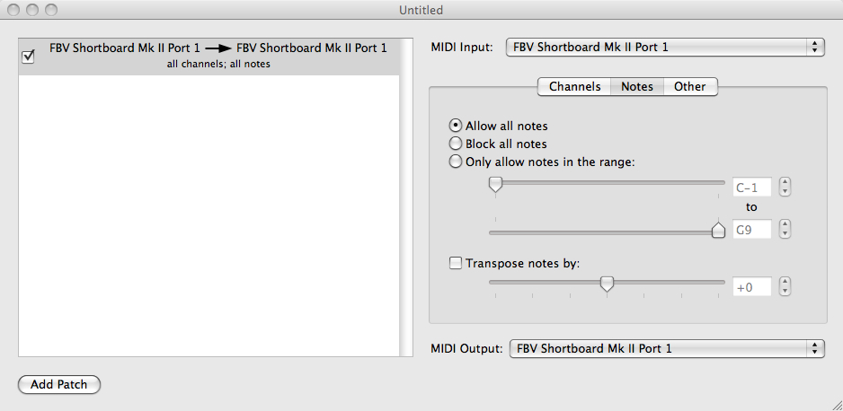The new board is REALLY cool. It’s solid in it’s construction and small enough to fit in my laptop bag. After I downloaded the FBV Control software from Line 6. I tried to set up a SooperLooper session in AU lab. The concept was to run the AU of SooperLooper in AU Lab and use a midi patchbay to make sure the signal was going from the FBV to the Sooperlooper session. Here are the patchbay settings.