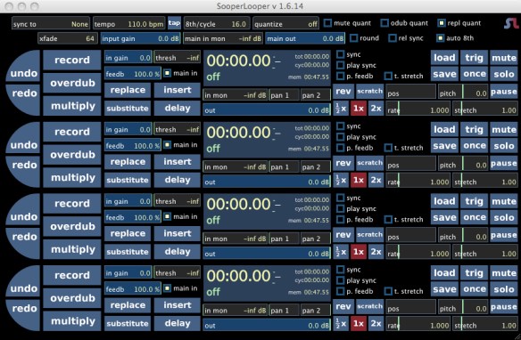 The advantages of AU lab are several (including low CPU use and that you can route audio OR midi through it) but the main advantage is that when you save the session all of the parameters in all associated plug-in’s applications are saved. In other words – when I get it set up for use with a PA – it’s done. No more re-inventing the wheel. This is particularly helpful when you’ve set up a series of midi commands for Sooper Looper.