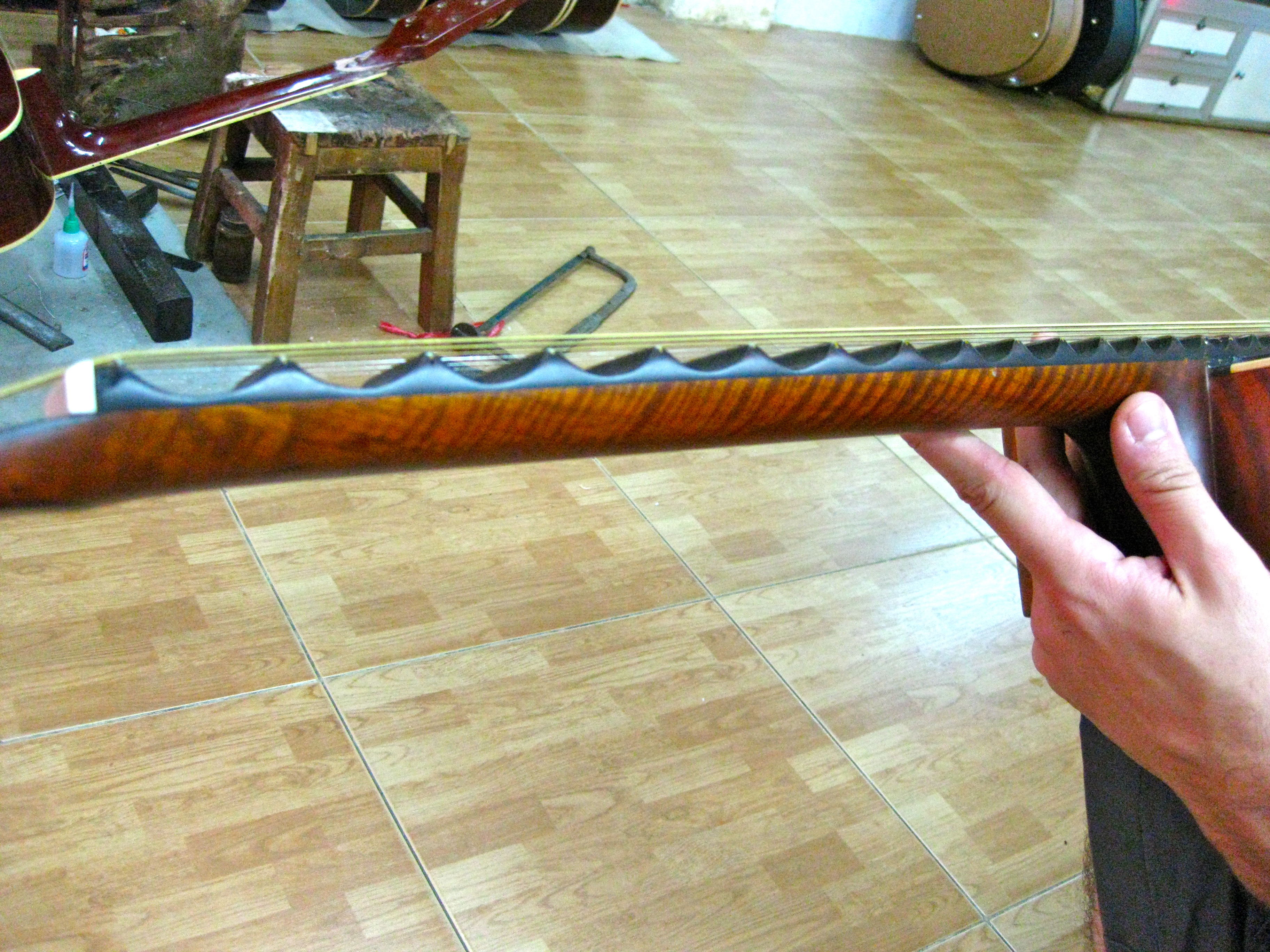 Bizarre tuning and the body construction was lower quality so the tone was very tinny. Note the scalloped fingerboard. There’s a better photo below of just how deep the scallop is.