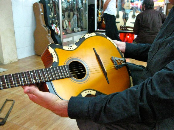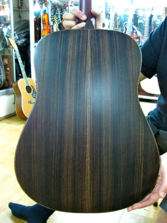 Here’s the back of the guitar (I had to take my shoes off to enter the store hence the socks!)