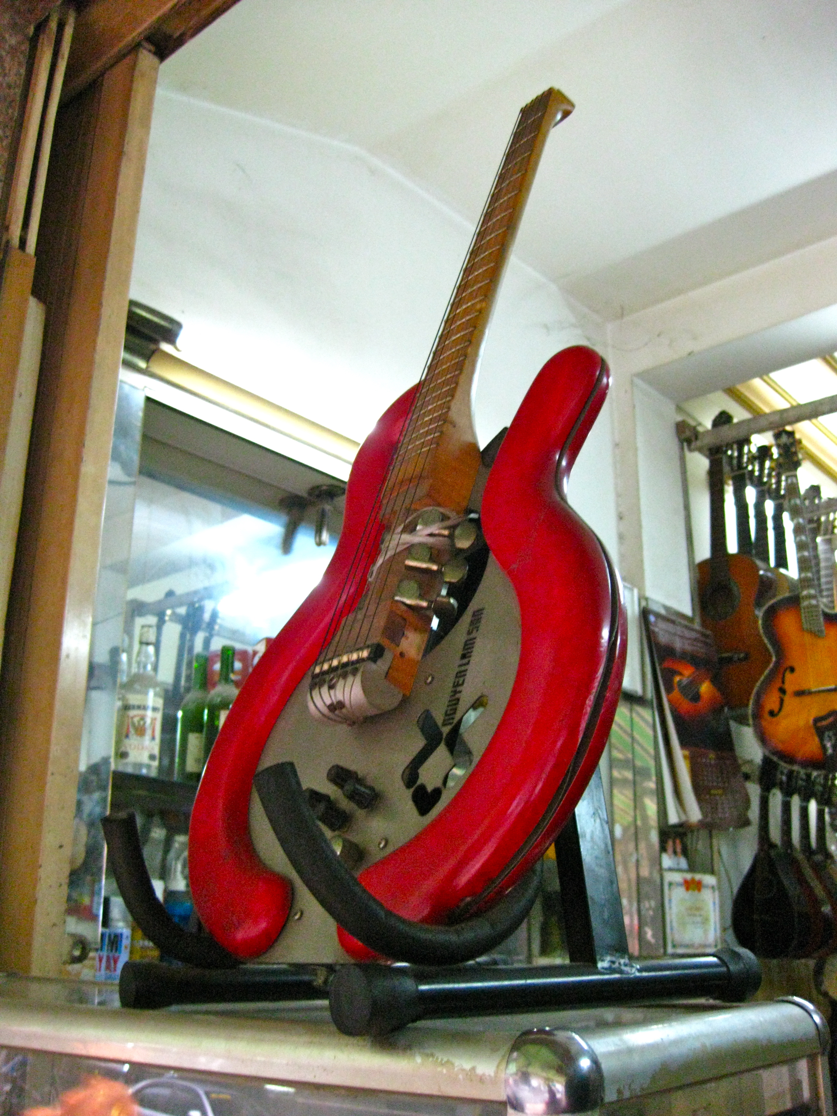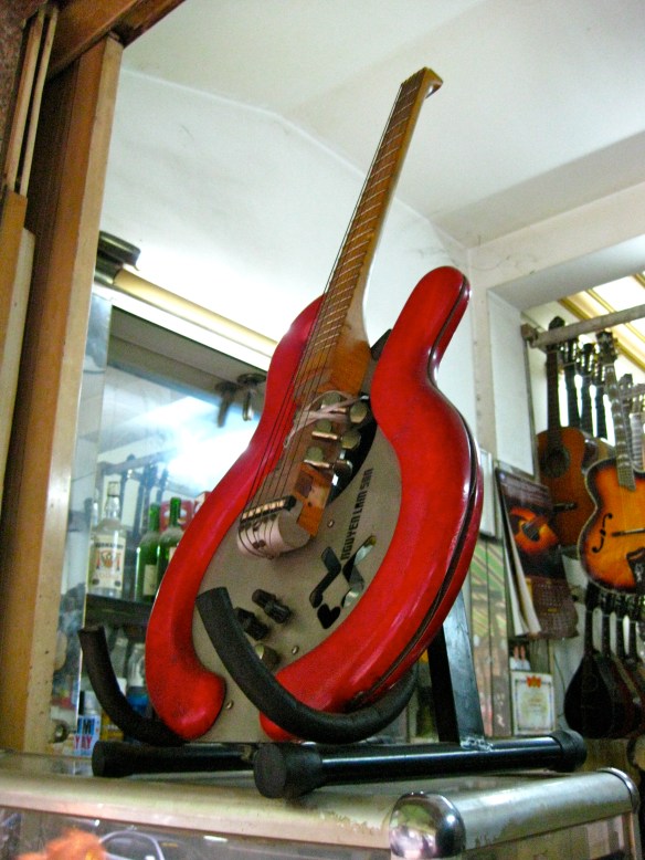 This next one was special. That was at a 2nd hand shop about 4 doors down on the other side of the street. A piece of sheet metal with wood bracing on the sides. The wood on the lower bout was cracked in the middle. The back of the neck had kind of a Stevens cutaway if you remember those. It looks like there was a magnetic pickup towards the bridge that was filled in with wood. and maybe one by the neck. There was a plastic bag tying it to the guitar stand – and I don’t know Vietnamese so unfortunatelyI was only able to guess that the woman filling in at the store didn’t know if it was for sale or not. I’m not even sure it was functional but that didn’t stop me from lusting after it.