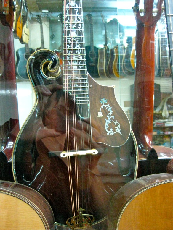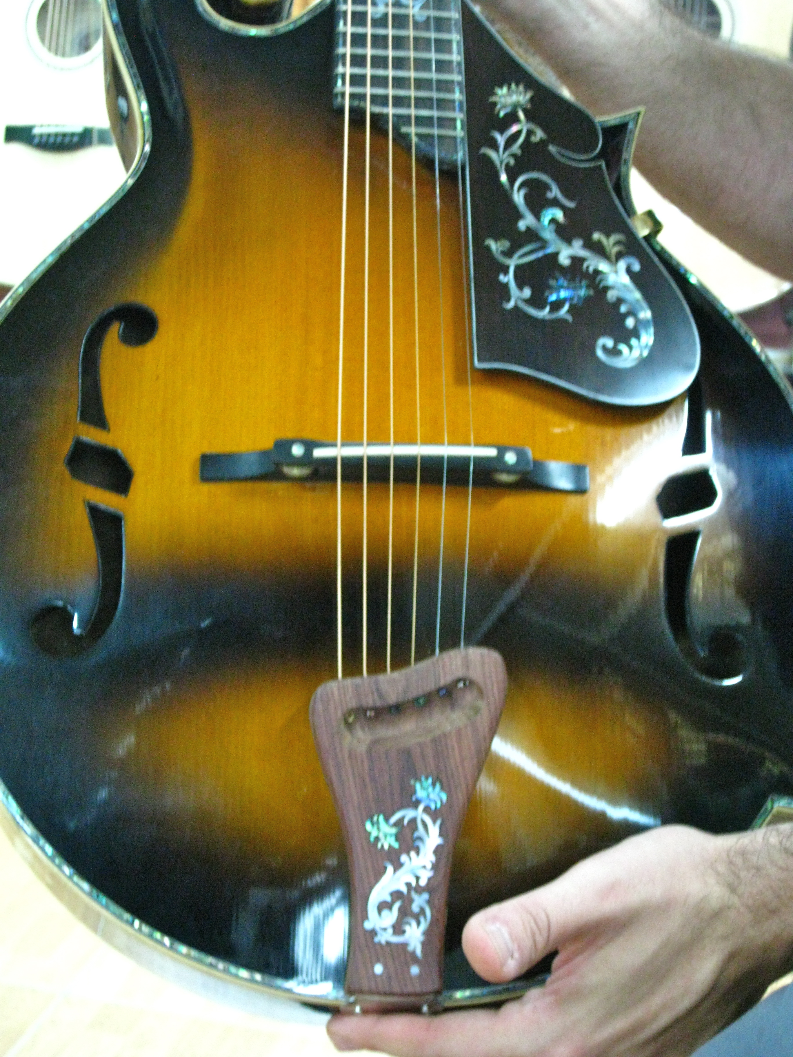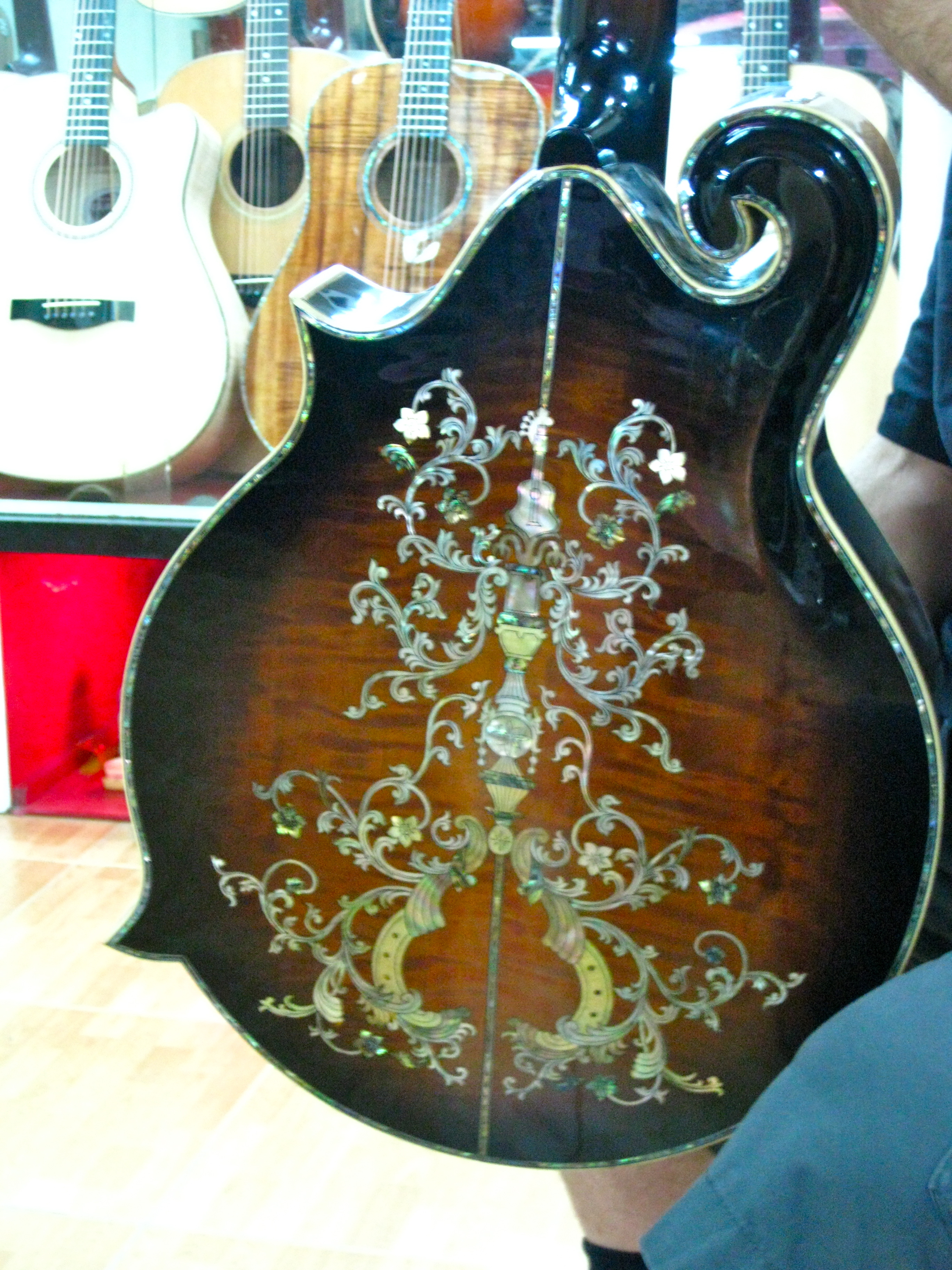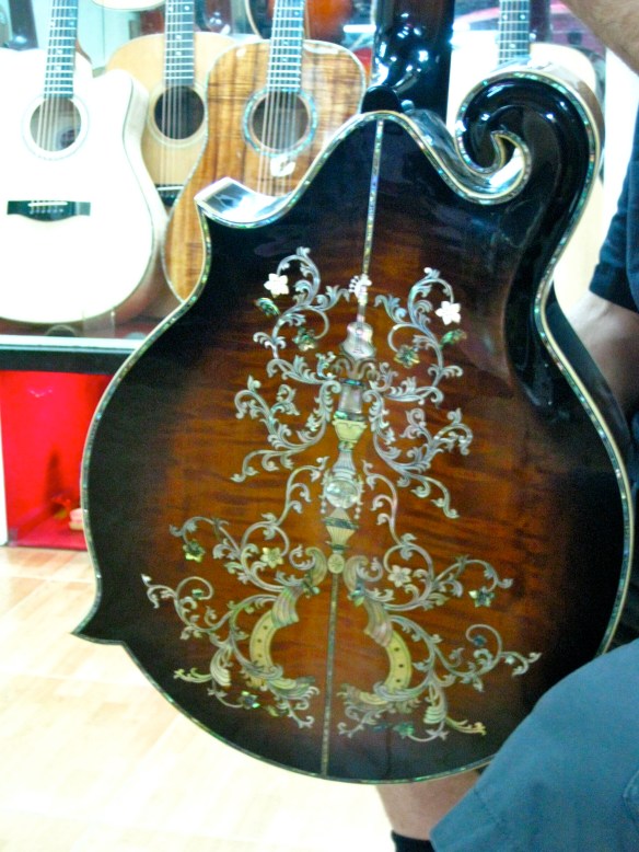 Here’s an archtop mando I was able to try. Check out the fingerbaord inlay: