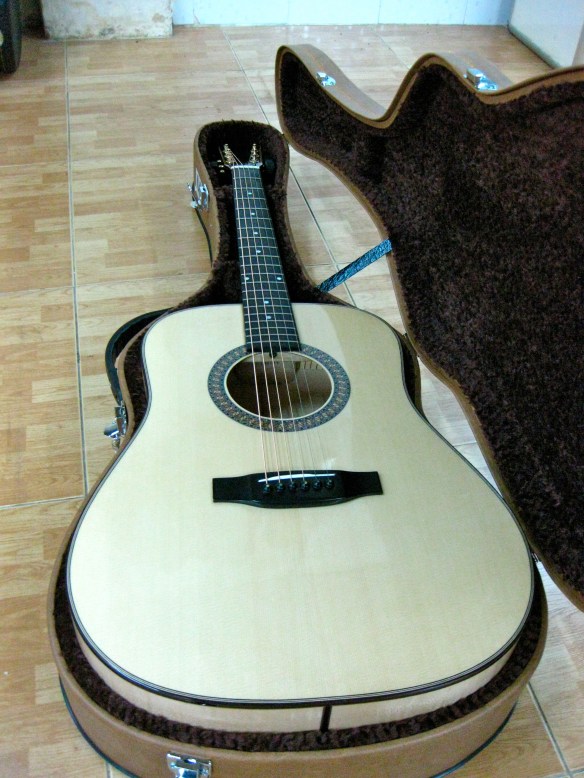 A few days ago I was looking ahead in my Vietnamese textbook when it hit me. Guitar! Why not? Guitar to accompany myself while singing seemed like an obvious lubricant to my faltering language skills. Vietnamese love their folk music. My guitar chops are primitive: just strumming and a bit of finger-picking I remember from college days of yore. I wasn’t looking for anything too high-end but I wasn’t going to buy a piece of crap either.
