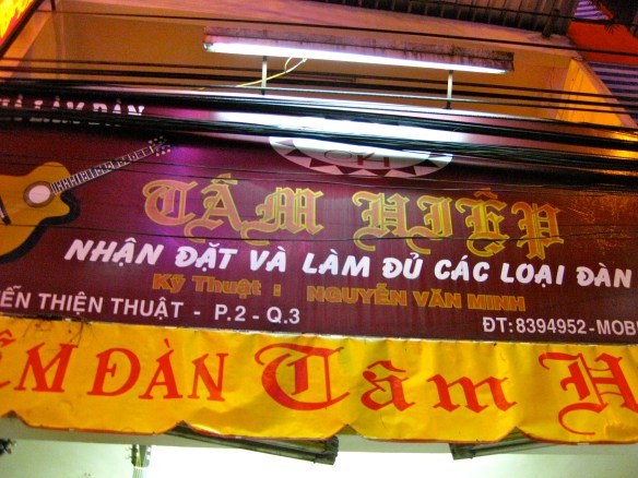 After reading a great set for forum posts on harmony central (link is broken) about a guitar factory in Vietnam – I decided to try to find the guitar street – a 500 meter stretch of Nguyen Thien Thuat street (between Nguyen Thi Minh Khai and Nguyen Dinh Chieu) with over 20 guitar shops. The one that I’ve read about online the most is Duy Ngoc (named after the owner), but the harmony central article mentioned another builder, Binh – who works out of Tam Hiep @ 36 Nguyen Thien Thuat.