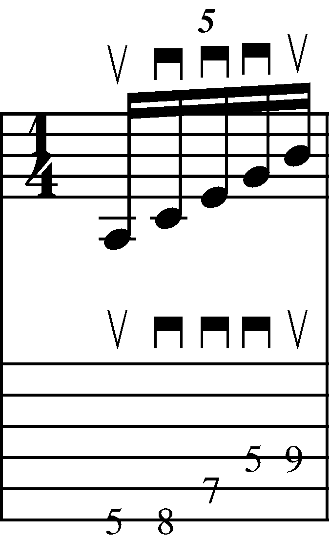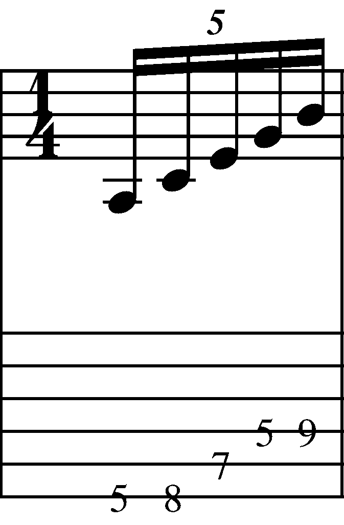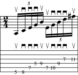 Timing – you’ll notice that this is a group of 5 (i.e a “Quintuplet” or “Pentuplet”) which means that you are playing 5 notes to the beat. The key here is to make sure that you are playing the notes in an even division – (i.e. the same length of time for each note and each space between the notes).