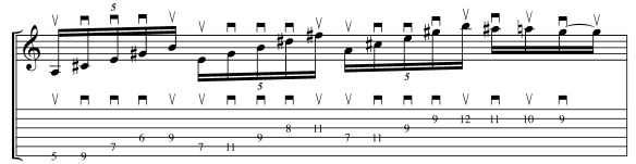 Picking – you could play this with alternate picking or all hammers – but I’m going to recommend a specific picking pattern for this arpeggio: