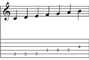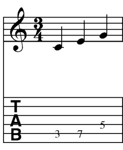 When improvising over a C major chord, the first thought for many beginning improvisers is to use the C major scale as a melodic resource. For example: here are the notes of a C Major triad (C, E, G) broken up into a sample 2 string arpeggio: