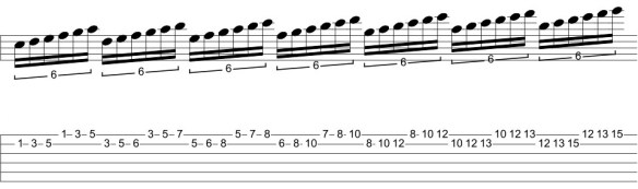 At the top of the page, I showed how I extracted arpeggios by eliminating the 3rd and 5th note from an ascending 3-note per string pattern. This same process can also be applied positionally. For example, here’s a 3-note per string C major scale played in 8th position.