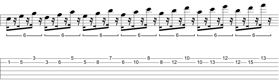 Michael Angelo Batio was the first rock guy I saw playing this type of pattern in a shred context but now the sound of it is pretty common rock/metal vocabulary. This idea will get covered more in part 12 of this series, but to make it sound a little cooler, instead of playing it over a C major chord – try playing the above arpeggio over an A minor chord: