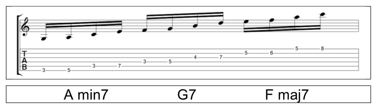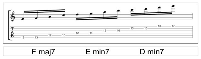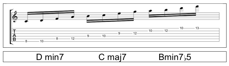 Now I’ll apply each of these arpeggio shapes to the C major scale starting with the root position. Notice that the 6-string shape links together a D minor 7, C Major 7, and a B minor 7b5 into one big arpeggio.