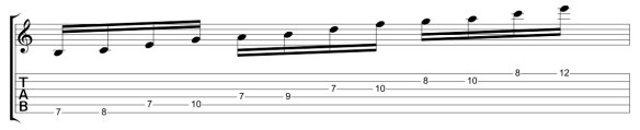 As I mentioned in the previous arpeggio post, a distinct advantage of 2-string patterns is that you can move them in octaves and maintain the same fingering. Here’s a C major 7 arpeggio moved in octaves on the middle and top set of strings.