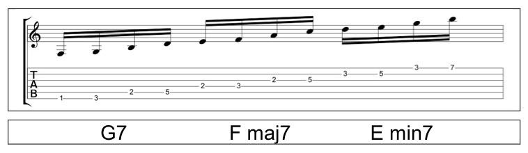 This time, we’ll remove the 3rd and the 5th note from each shape. This will create a 7th chord arpeggio in the 3rd inversion (i.e. starting from the 7th).