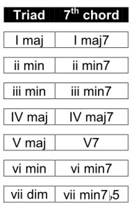 - 7th chords: C major 7, D minor 7, E minor 7, F major 7, G7, A minor 7 and B minor 7b5