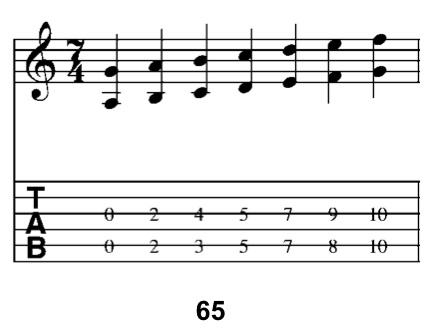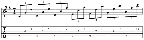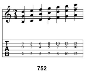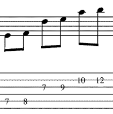As I mentioned earlier, these voicings can be played as melodies simply by playing the notes one at a time. In The GuitArchitect’s Positional Exploration and the GuitArchitect’s Guide to Modes: Melodic Patterns, I’ve outlined a series of methods for generating melodic variations. But since this approach is about combining things, it makes sense to at least look at some melodic possibilities with regards to note choice. I’ve decided to take a three-note voicing as it offers enough possibilites to be interesting, but not too many to be over-whelming and have chosen this pattern simply because I like the first voicing.