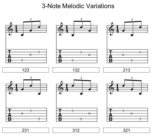 These numbers represent note order. Assigning 1 as the lowest note and 3 as the highest – here are the unique variations on the first three notes.