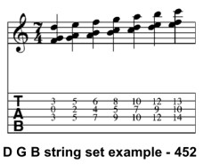- I’ve written out an example based on the D, G and B string set (i.e. 432) and gone with an initial voicing of a F, G and D (or 452).