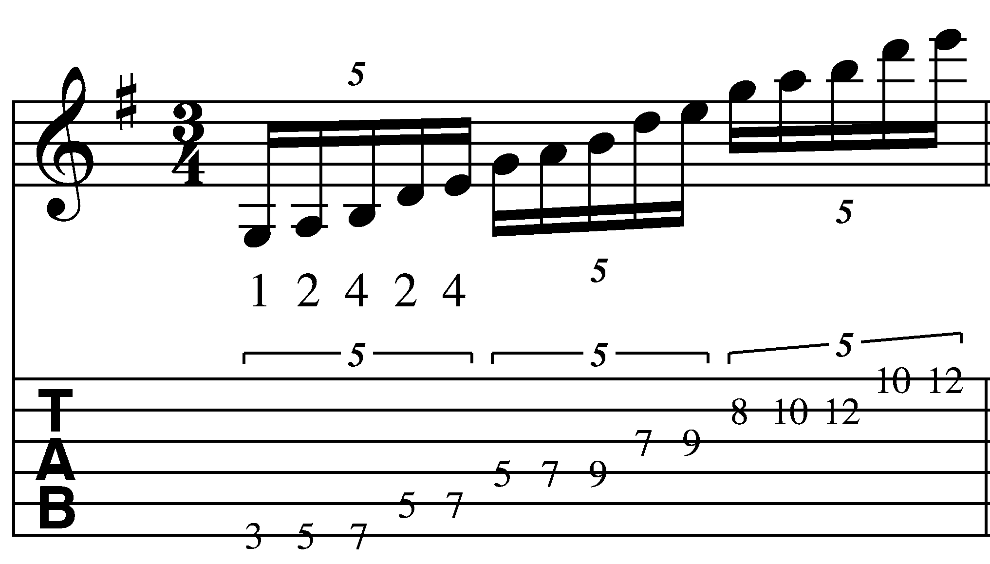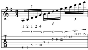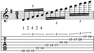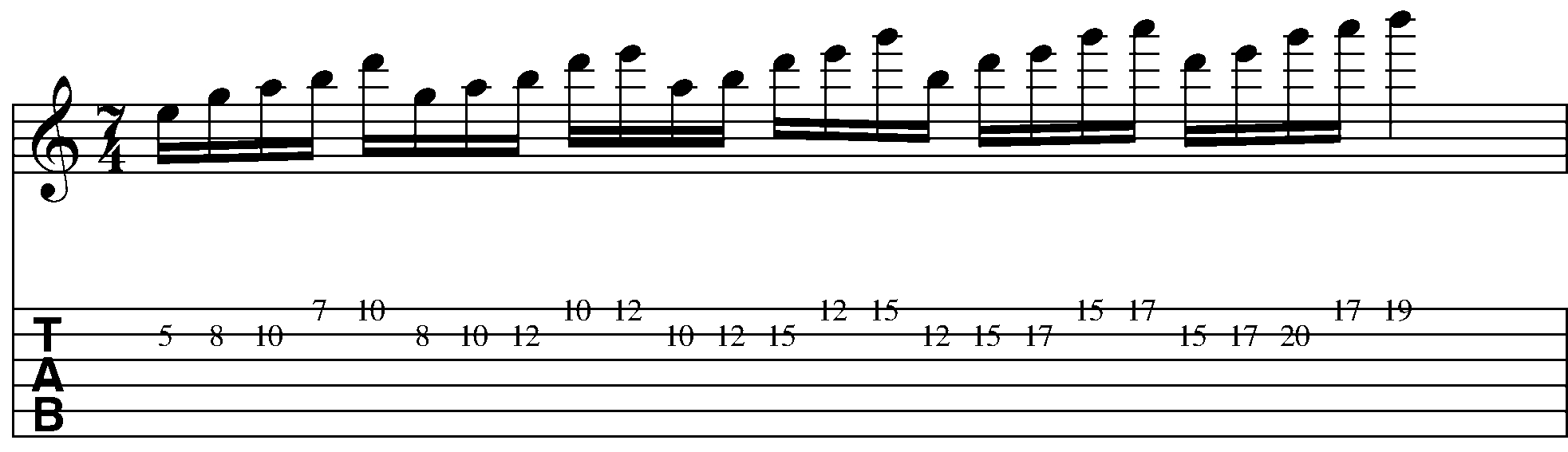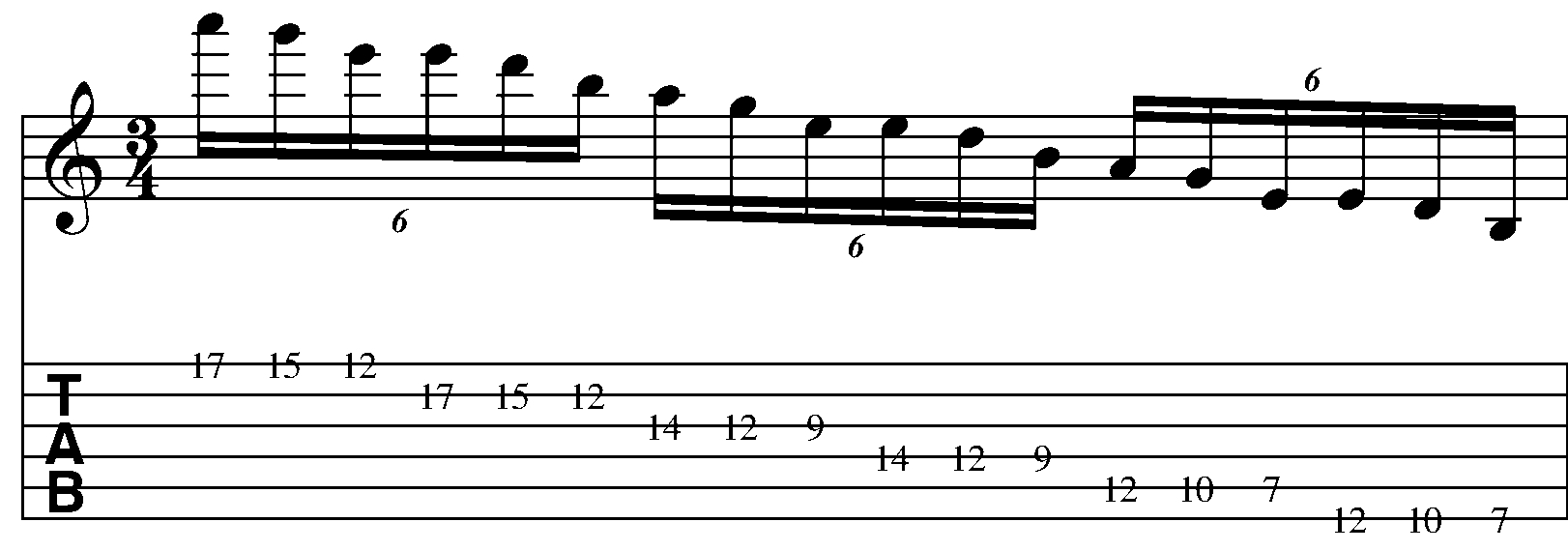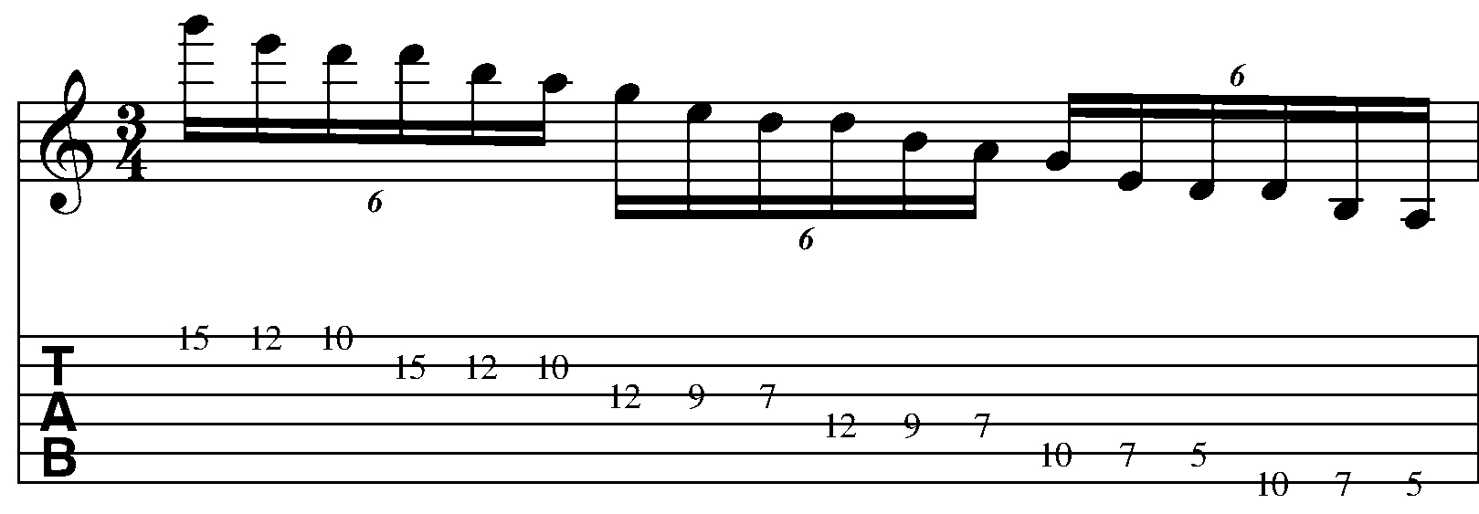 - Starting on the Bb on the G string, I’ve rhythmically copied the same phrase as on the A and G strings. By playing it as a pattern, it creates some consistency in the phrase. While the rhythm is sextuplets – the phrasing is alternating groups of 4 and 6.