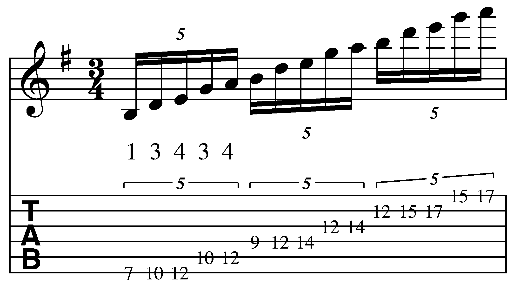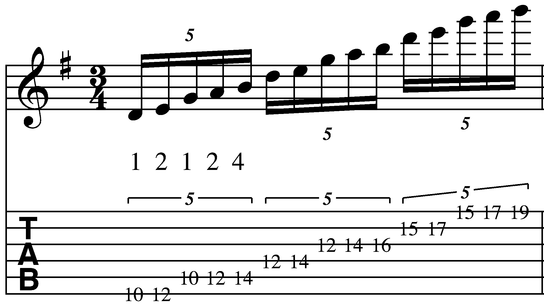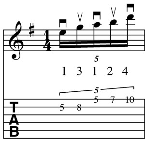 Picking this as I have above results in a smoother (almost legato) sound than I could get using alternate picking, even though I’m still picking every note. For the initial fingering, I’m playing the first 2 notes of each grouping with my 1st and 2nd fingers to facilitate the slight positional shift on the B and E strings.