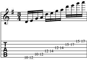 Playing notes in order can be boring, but as we saw with the octave C jump in the first lick, alternating scale notes in different registers can be much more interesting melodically. Since the A and B string are a 9th apart, playing an ascending melody between the strings works well positionally.