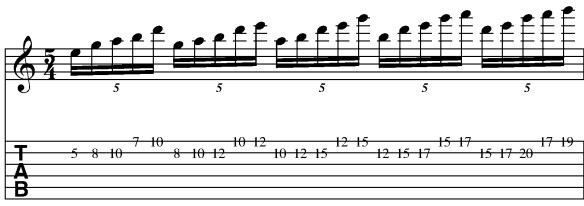 Playing arpeggios on smaller string sets allows me to sequence ideas more easily (Like the first 5 notes). The jump to the Eb is probably the biggest surprise in the phrase. Short but sweet.