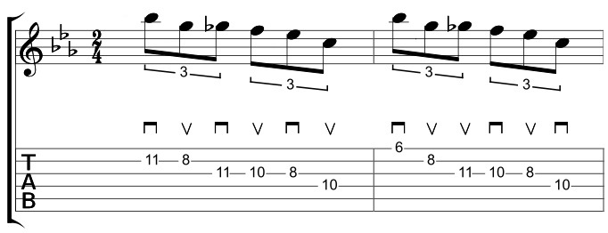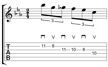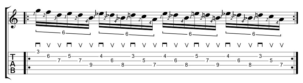 This allows me to use all down-strokes and hammer-ons when ascending the scale which helps create a more fluid sound.