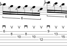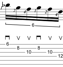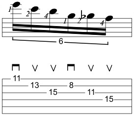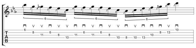 Here’s a mp3 at different tempos. As with lick #2, the first pass is phrased at 16th notes and the second at sextuplets.