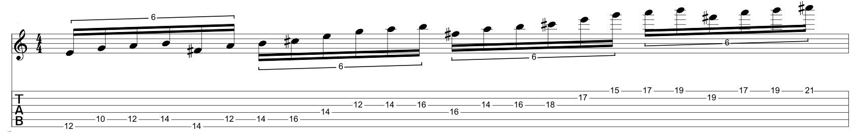 While I practice ideas like this in 16th notes to get them under my fingers, I find the phrasing to be a little mechanical. So, after I get the fingering down, I’ll typically move it to other rhythmic groupings. Moving it to sextuplets in this case, puts the accents in more interesting places (and makes it a 4/4 phrase rather than a 3/4 phrase):