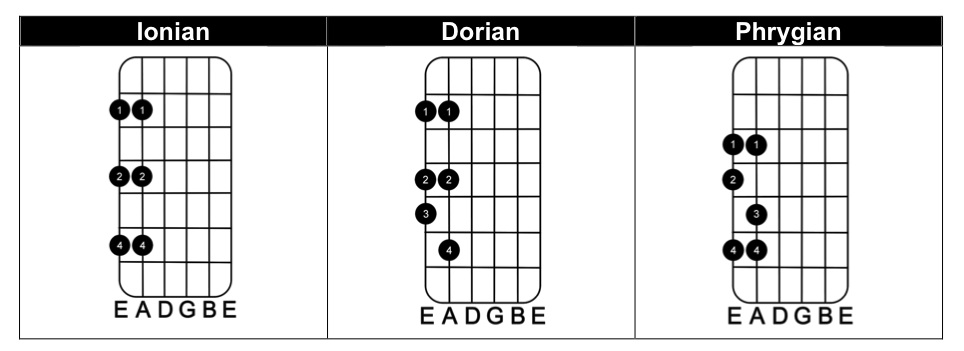 - The major scale can be broken down into seven two-string modes that follow a specific order based on its scale degree from the parent scale (Ionian, Dorian, Phrygian, Lydian, Mixolydian, Aeolian, Locrian). The two-string patterns are modular and can be adapted to positional playing.