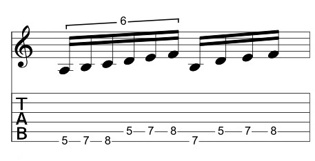 If you’re used to alternate picking, that will work as well but I find that the semi-swept approach of the first example gives me a more uniform sound for legato playing. It’s counter-intuitive but check the A minor straight ascending mp3 below to see what I mean.