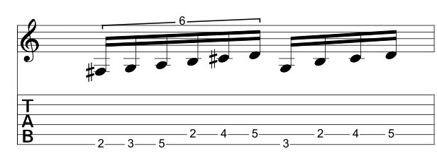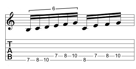 This idea uses the same 3-note-per-string / two string idea that’s behind all the visualization process here. But to review: Let’s start with a B Locrian scale pattern on the E and A strings: