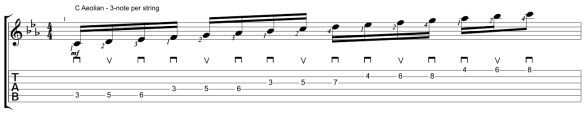 For an initial starting point, I’m going to look at a 3-note-per-string C Aeolian scale.  Try running this scale a few times with the fingering and picking patterns I’ve provided to make sure it’s under your fingers.