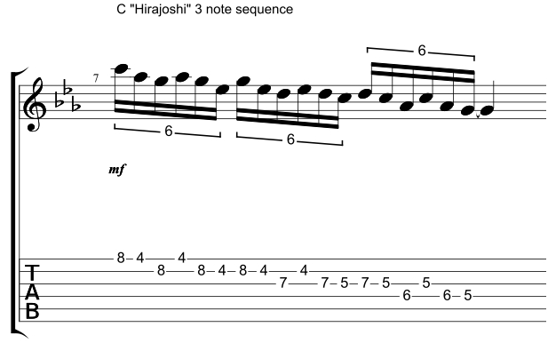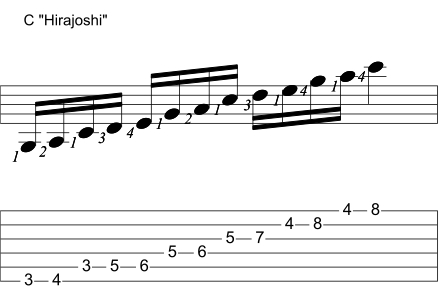 The term, “Hirajoshi”,  actually refers to a Koto tuning.  In the Japanese scale system, this collection of intervals would be recognized as belonging to the In scale.  But since so many guitarists refer to this as Hirajoshi, I’ll use that nomenclature here.