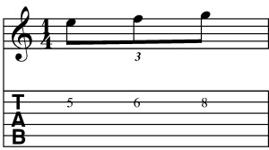 A position is usually defined as a four-fret section of the fingerboard.  If the scale is broken down into positional components, we end up with a series of three-note shapes.  We’ll number each one from the scale degree for now: