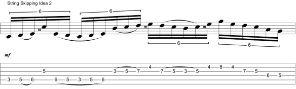 Playing notes in order can be boring, but as we saw with the octave C jump in the first lick, alternating scale notes in different registers can be much more interesting melodically.  Since the A and B string are a 9th apart, playing an ascending melody between the strings works well positionally.