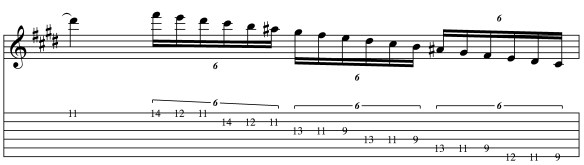 This ends in a pretty pedestrian B major (C# Phrygian) scale run. In soloing I would typically try to develop it into something else – but for the purposes of a sound demo – it makes sense to have a short lick with a definitive ending.