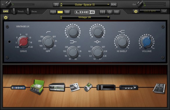 Here’s a screen shot of a modification I made on the Outer Space preset. I just added a preamp in the beginning of the chain.